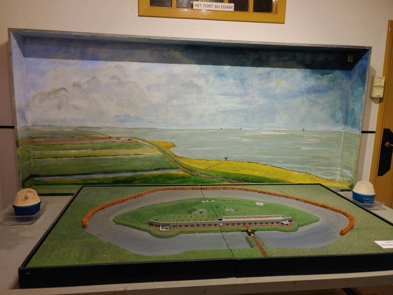 Op een tafel is een miniatuur te zien van het Fort bij Edam, het kenmerkt zich door het Fort in het midden van het water met het Markermeer op de achtergrond.
