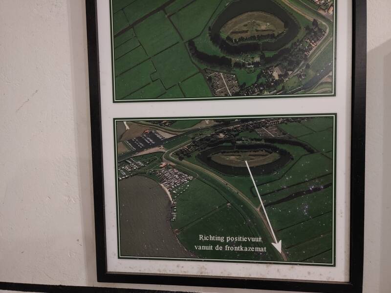Op een luchtfoto is de richting positievuur vanuit de frontkazemat te zien.