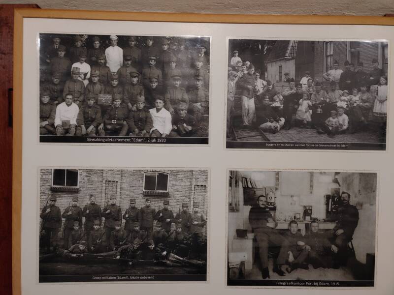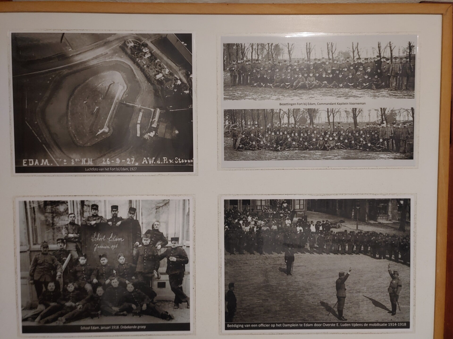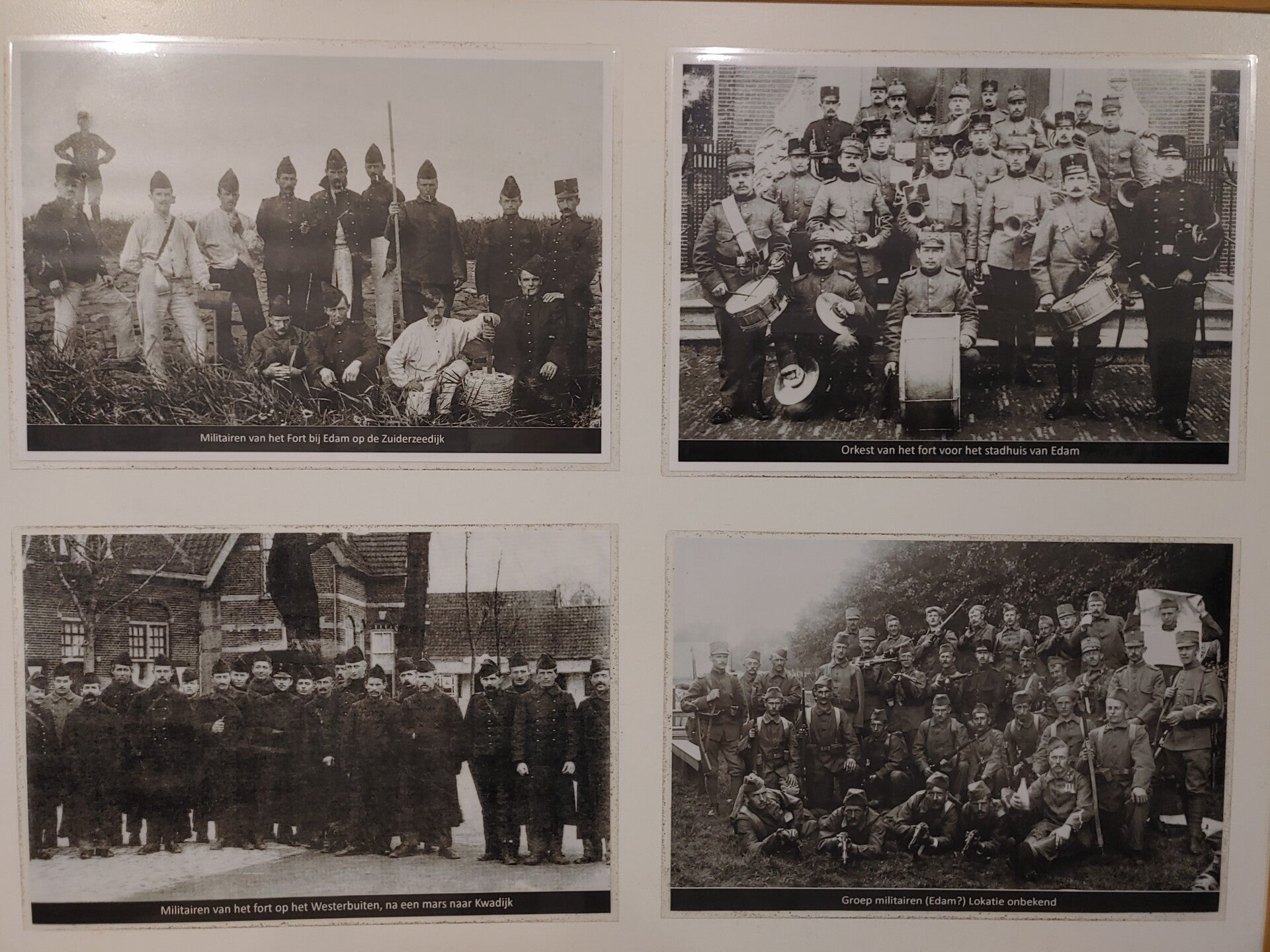 Rechtsboven zijn burgers en militairen gezamenlijk in de Gravenstraat in Edam. Rechtsonderin de vier militairen bij de Telegraafkantoor bij het Fort in 1915.