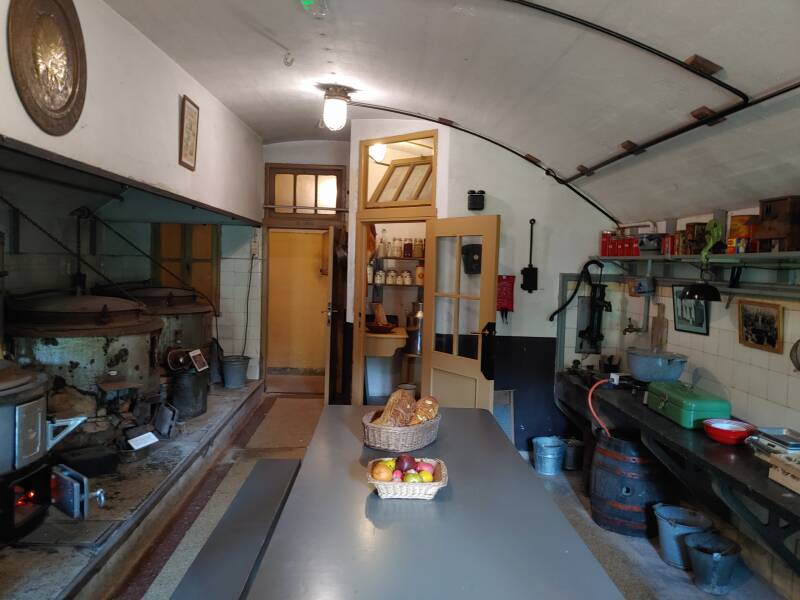 Op de foto is de keuken te zien, de grote kookketels waren bestemd voor 300 militairen die in het Fort aten.