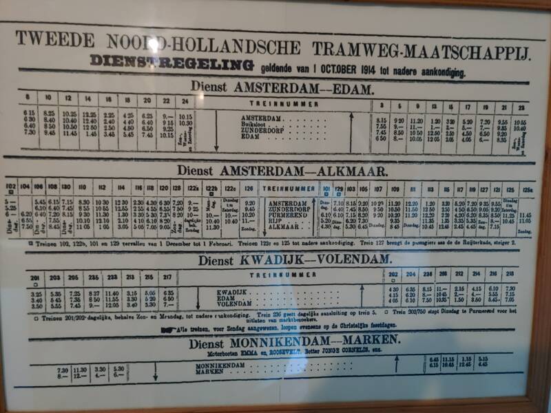 Via een papier valt er te lezen over de dienstregeling vanaf oktober 1914, de ritten met verschillende bestemmingen: Amsterdam - Edam, Amsterdam - Alkmaar, Kwadijk - Volendam en Monnikendam - Marken.