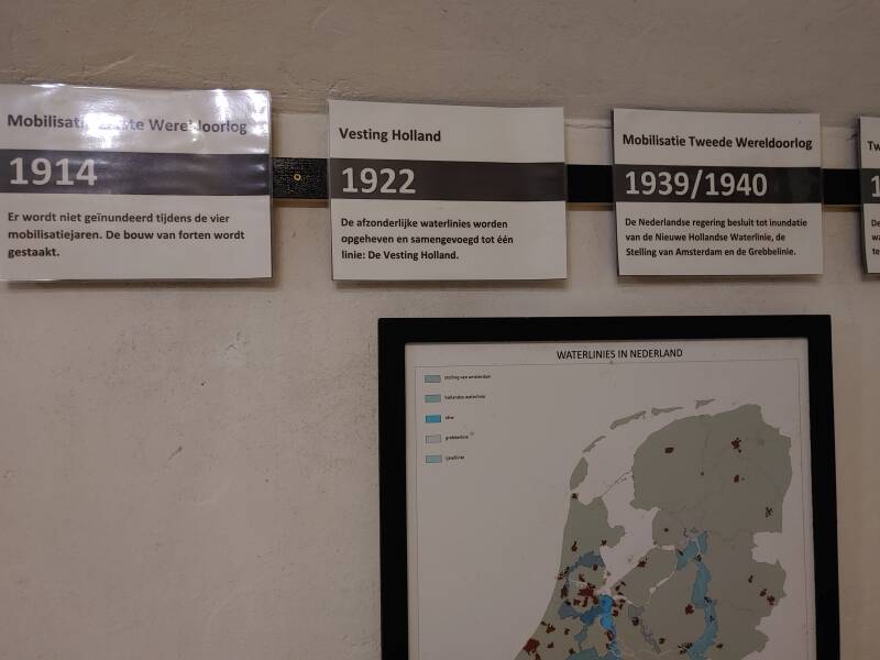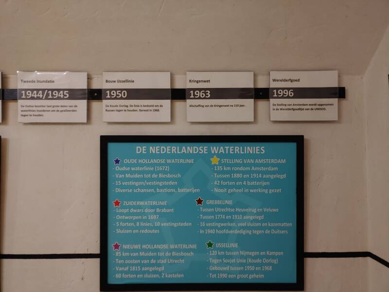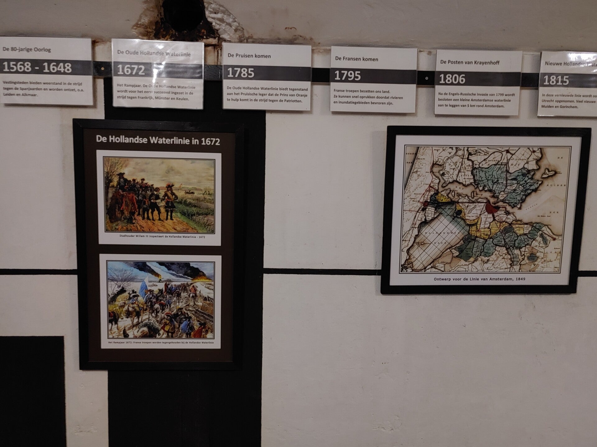 Een tijdlijn laat de strijd zien met de vestingen: 1568 - 1648 (De 80-jarige Oorlog), 1672 (De oude Hollandse Waterlinie - verdediging van Holland in de 17e en 18e eeuw), 1785 (De Pruisen komen - In strijd tegen de Patriotten, de Oude Hollandse Waterlinie bood weerstand).