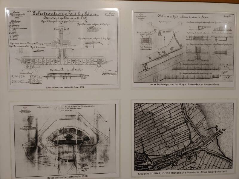 De bovenste linkerfoto toont een luchtfoto van het Fort bij Edam in 1927.