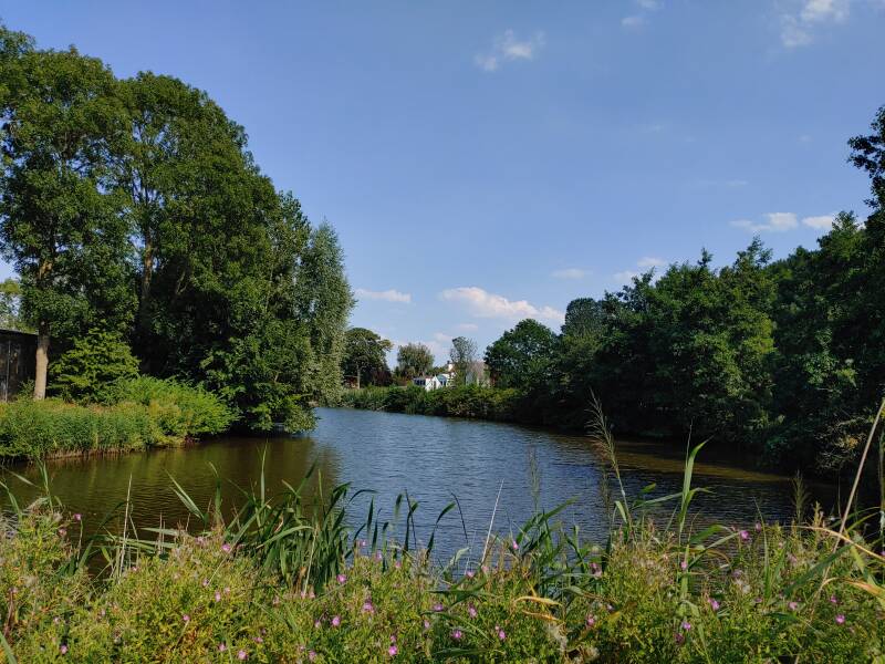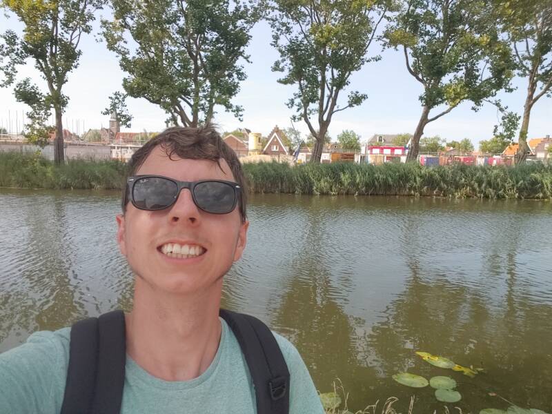 Ik liep over een kort paadje waarna ik in het weiland belandde. Het was die dag, zondag, bloedheet, ruim 30 graden! Tussendoor eventjes pauze genomen om wat te drinken en te eten. Bij het weiland kwam ik bij de provinciale weg terecht, ik vroeg weer aan iemand hoe ik kon lopen naar Edam, langs de snelweg liep een (fiets)-weggetje met een tunneltje en bij een kruispunt naar rechts, en van het zuiden van Volendam in Edam terechtgekomen! Ik herkende nog veel aan Edam: de bouw van appartementen, de vaart, en de molen, de molen draaide! Dat duurde lang, vorig jaar deed de molen het even niet, maar die dag wel.