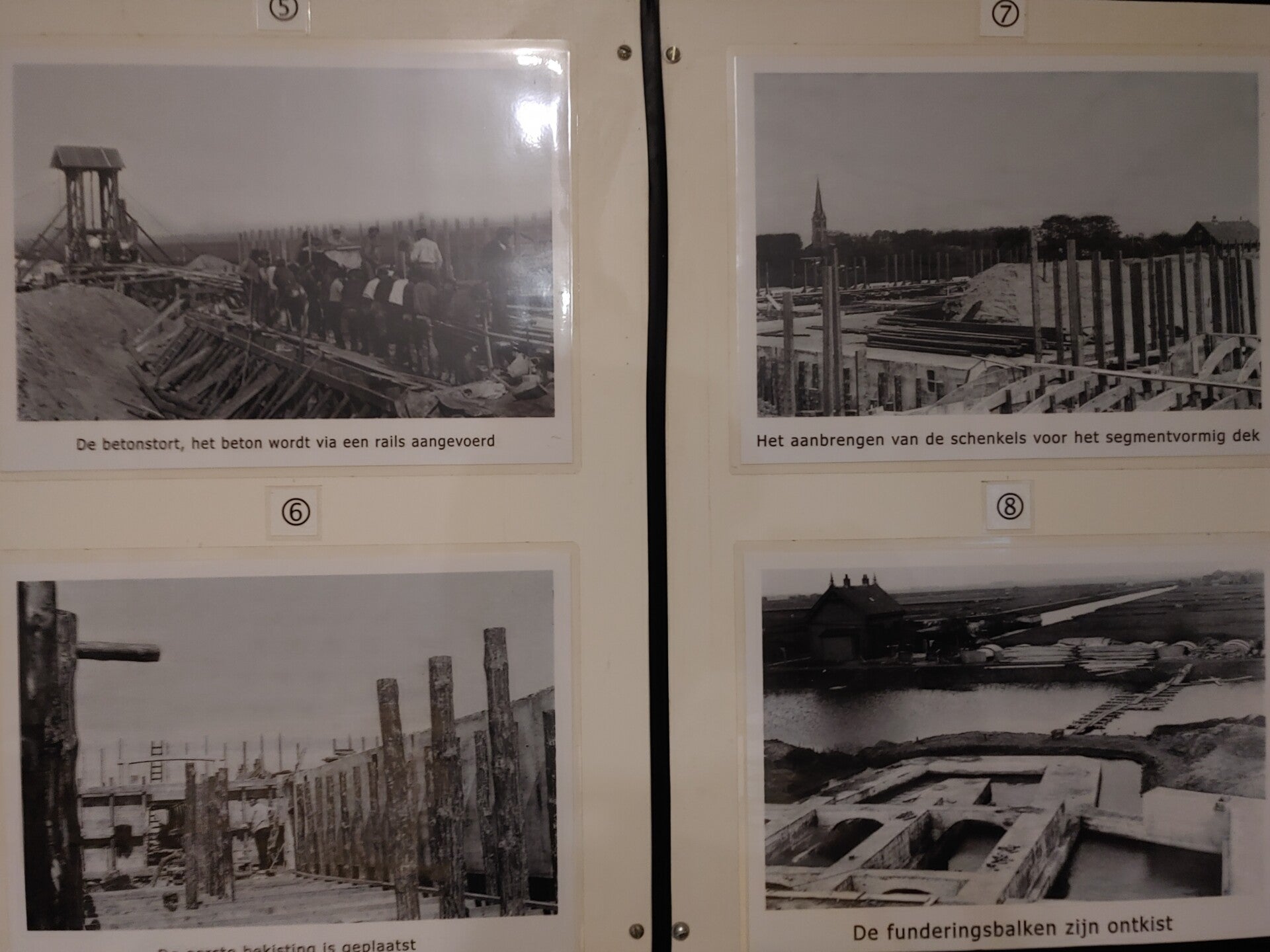 De funderingsbalken die worden gebouwd. De betonstort. Het verder uitvoeren van de fundering, het aanbrengen van de schenkels van het segmentvormig dek en de funderingsbalken van het hoofdgebouw en het resultaat van het Fort.