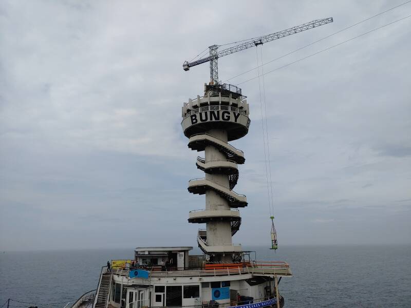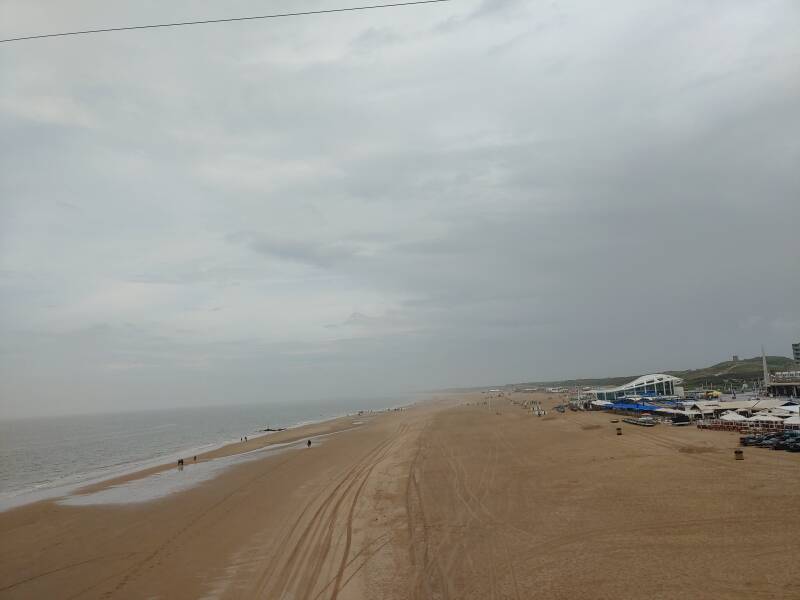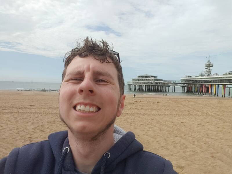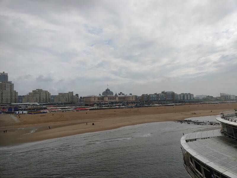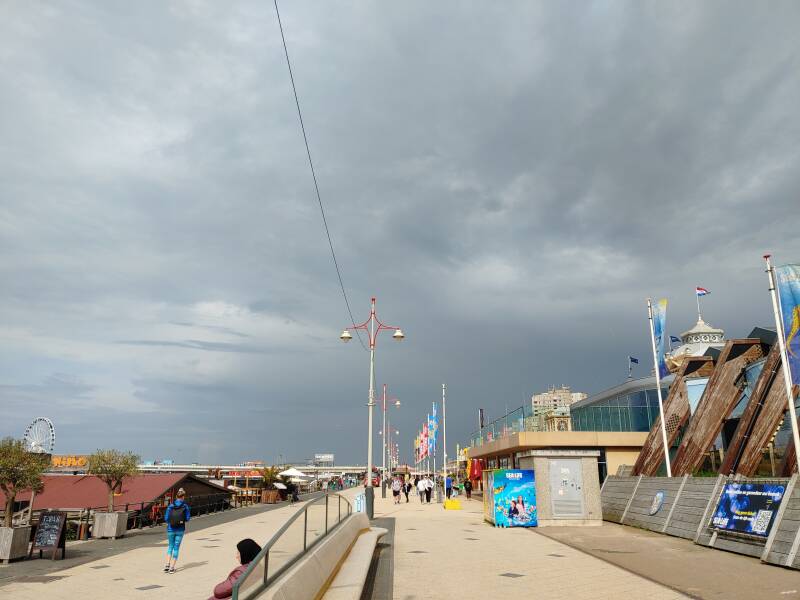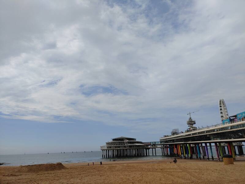 Toen wandelden we over de beroemde pier. De Scheveningse pier is een pier in de Noordzee bij Scheveningen. De eerste pier, het Wandelhoofd Koningin Wilhelmina, werd door architect W.B. van Liefland en constructeur W. Whyhowski in opdracht van Maatschappij Zeebad Scheveningen (M.Z.S.) ontworpen en door prins Hendrik op 6 mei 1901 geopend. De eerste pier had een lengte van 372 meter en een breedte van 8 meter. De huidige pier, gebouwd in 1959, is gebouwd door een bouwcombinatie van VAB (Verenigde Aannemings Bedrijven) en HBM (Hollandsche Beton Maatschappij). Op vrijdag 19 mei 1961, een koude dag, werd de pier geopend door prins Bernhard, vergezeld werd door Adama Zijlstra en president-commissaris Jaap van Till. De uitkijktoren werd geopend op 19 april 1962. De pier bestond uit een 12 meter brede wandelpromenade die door een 8 meter breed open, en een vier meter breed overkapt deel werd verdeeld. Op de promenade en de eilanden waren verschillende attracties, souvenir- en andere winkels gevestigd. De huidige pier was met 12.000 vierkante meter tweemaal zo groot als de oude. De toegangsprijs, des tijds, bedroeg 0,50 gulden voor toegang. Al na twee dagen kon de honderdduizendste bezoeker worden geteld en op 23 september 1961 de miljoenste (!). Het was geweldig om op de beroemde pier te staan met uitzicht over het strand, de zee, en de boulevard!