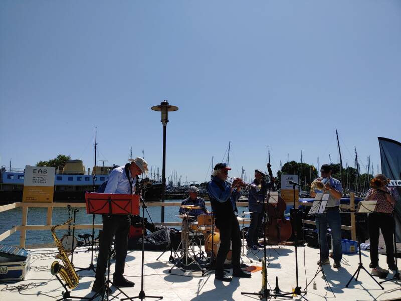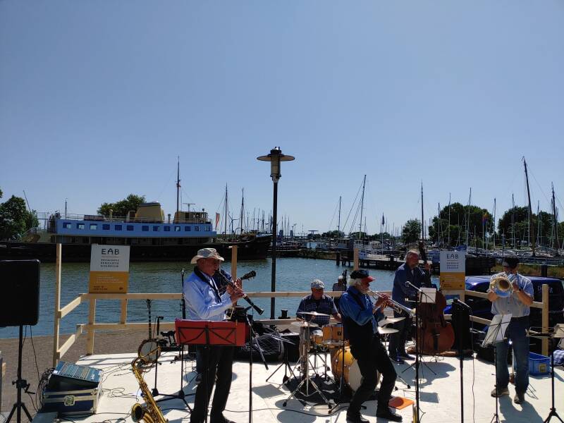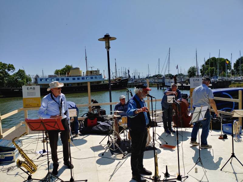 Op 3 juni was er Jazz Festival in de binnenstad. Op ieder gedeelte van de binnenstad werd muziek gemaakt, Jazz en Blues. Hoe Jazz ontstond, dat begon eind 1800, rond 1900, in New Orleans toen muzikanten in kroegen en bordelen gebruik maakten van muzikale elementen uit de Europese klassieke muziek en voegden deze toe. In dat jaartal werd een goedwerkende combinatie van instrumenten gevonden om blues en ragtime (Honky Tonks) te spelen; dat waren instrumenten die gemakkelijk beschikbaar waren vanuit de fanfare en voldoende geluid voortbrachten zoals saxofoon - dat werd vanaf 1840 ontwikkeld door de Belgische bouwer van muziekinstrumenten Adolphe Sax (1814 - 1894), trompet - dat bestond al 2000 jaar, trombone, klarinet - dat werd waarschijnlijk rond 1690 uitgevonden door Johann Christoph Denner (1655 - 1707) en de Tuba, dat instrument werd in de jaren dertig ontwikkeld door Wilhelm Wieprecht (1802 - 1872) en J.G. Moritz.