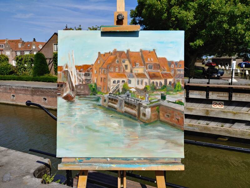 Het bruggetje, een verbinding met de Oosterhaven, het uitzicht over het water met op de achtergrond de eeuwenoude woningen en het Spui, de buitenhaven met het Accijnshuisje en de sluis met de Drommedaris en de Zuiderkerk. De tekenaars, schilders en het publiek genoten van de kunst van de stad!