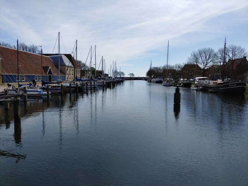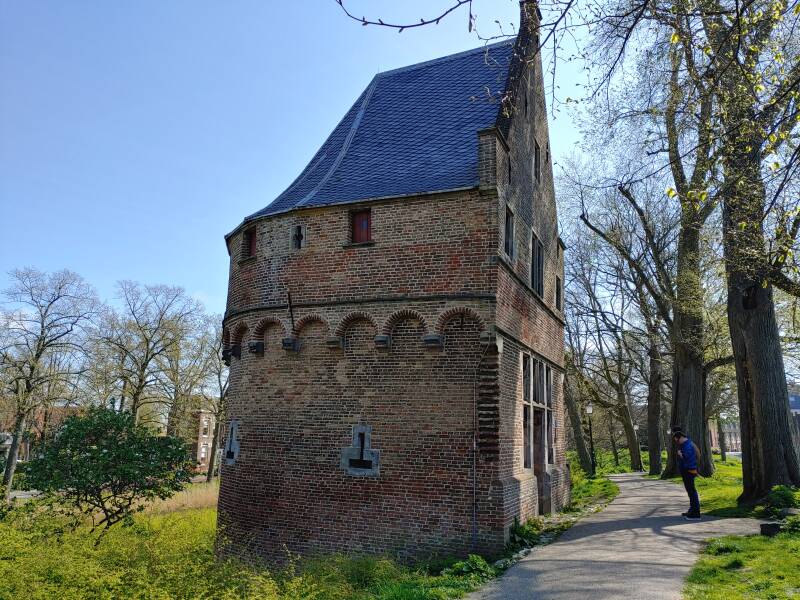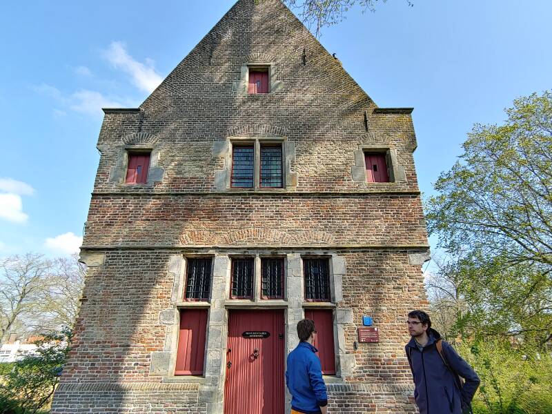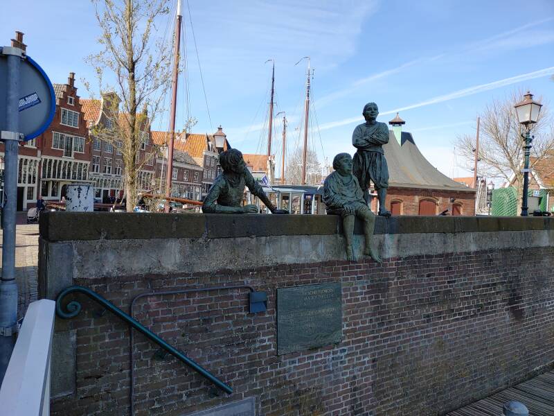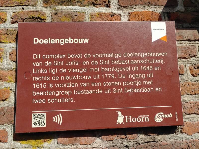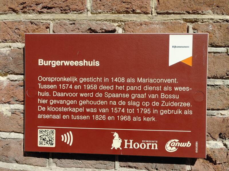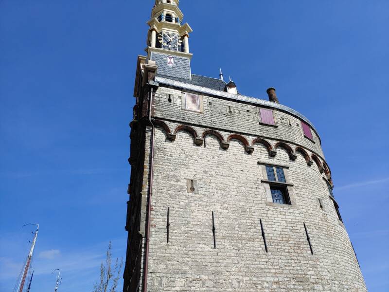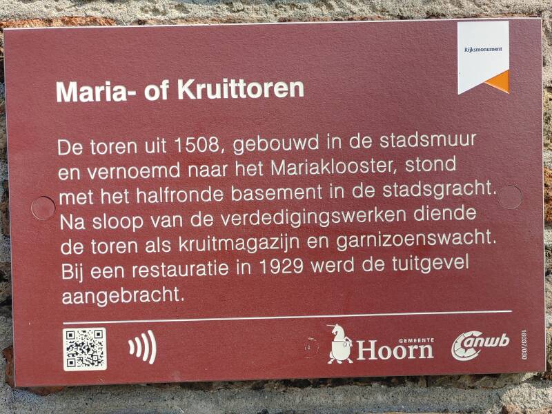 Via allerlei straten kwamen we aan bij een rijtje oudere huizen, het ging om de Bossuhuizen, de gevelstenen aan de huizen lieten tekeningen zien. Het vertelde over de slag op de Zuiderzee die de West-Friezen in 1573 hebben geleverd tegen de Spaanse vloot van admiraal Bossu. De Bossuhuizen staan ook op de monumentenlijst. We wandelden naar de haven en kwamen een hoge toren tegen. De Hoofdtoren is een van de laatste verdedigingswerken in het Noord-Hollandse Hoorn die bewaard zijn gebleven. In 1532 werd de toren uit Gobertanger kalksteen en baksteen getrokken. In 1632 volgde er bliksem naar de toren waardoor de toren verwoest werd. De toren werd hierna volledig herbouwd. Sinds 1965 staat de hoofdtoren op de monumentenlijst via eveneens Vereniging Hendrick de Keyser.