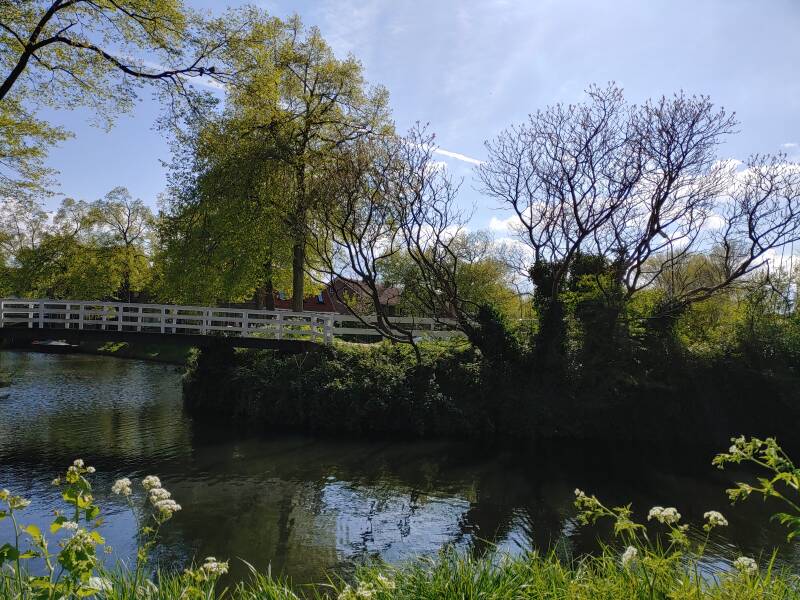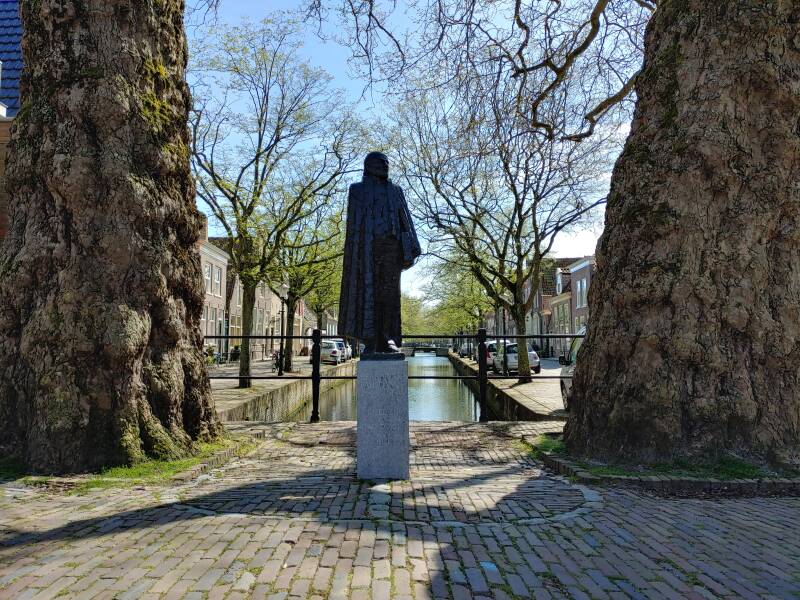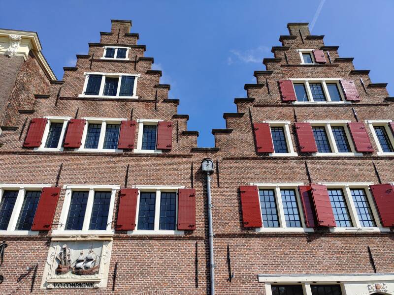 Om 12:15 stonden we voor de in- en uitgang van het station. Via een plattegrondbord van Hoorn voor toeristen wandelden we een prima route dwars door het centrum en daarbuiten gelegen omgeving. Allereerst trof ik een mooie locatie aan om een eerste foto te maken: een gracht met huizen met twee bruggetjes met een zonglinstering op het water. Vervolgens troffen we enkele meters verderop een torentje aan (Maria- of Kruittoren), aan de twee kleine ramen zaten tralies, het bleek een toren uit 1508 te zijn. De toren diende als kruitmagazijn en garnizoenswacht. In 1929 vond er een restauratie plaats waarbij er aan de toren de tuitgevel werd gebracht. Richting het centrum kwamen we een gebouw tegen met een opvallend verleden: de VOC-kamer (Verenigde Oost-Indische Compagnie).
